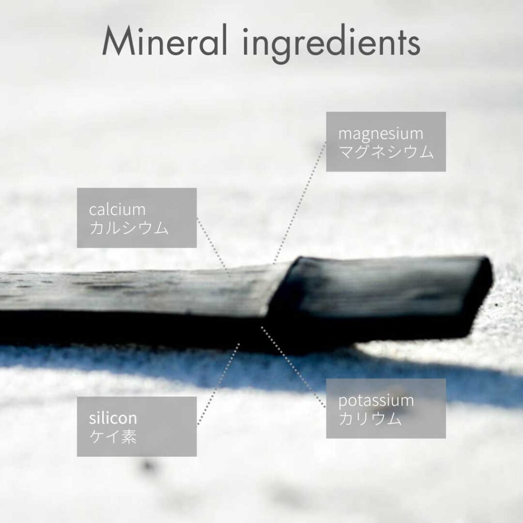竹炭は炭の中でも特にミネラルが大変多く含まれています。ミネラルの成分としては、カリウム、ナトリウム、カルシウム、マグネシウム、鉄、マンガン、ケイ素などがあり、特にカリウムやケイ素の含有量は非常に多く、竹炭には22.9%ものケイ素、14.1%ものカリウムが含まれています。ケイ素は、人間の健康にも重要視されるミネラル成分で、コラーゲン、エラスチン、ヒアルロン酸という美容に欠かせない3大要素を、体内の組織と結びつける働きがあります。また、カリウムは細胞の浸透圧を調整する働き、ナトリウムを排出する作用があります。
